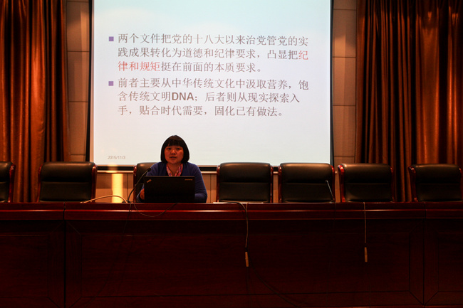 党课由无锡一中党委副书记、副校长马彩红主讲,马书记带领全体党员一起认真解读了《中国共产党廉洁自律准则》和《中国共产党纪律处分条例》。马书记特别强调,落实两大新规必须要有具体明确的要求:一是坚决维护党章权威;二是坚持问题导向,把严守政治纪律和政治规范放在首位;三是把纪律和规矩挺在前沿。