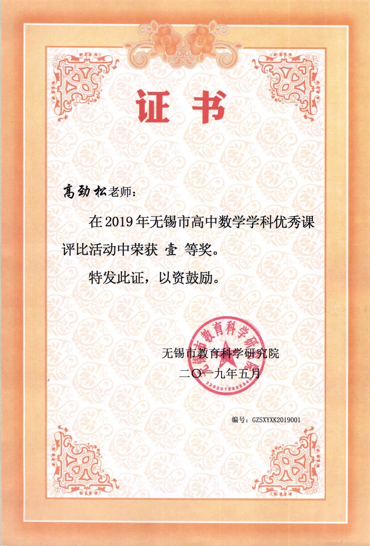 2019年5月10日,由无锡市教育科学研究院组织的2019年无锡市高中数学学科优秀课评比活动在洛社中学举行。我校青年教师高劲松经过层层选拔,在大市决赛中取得一等奖第一名的优异成绩。