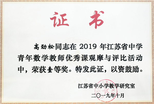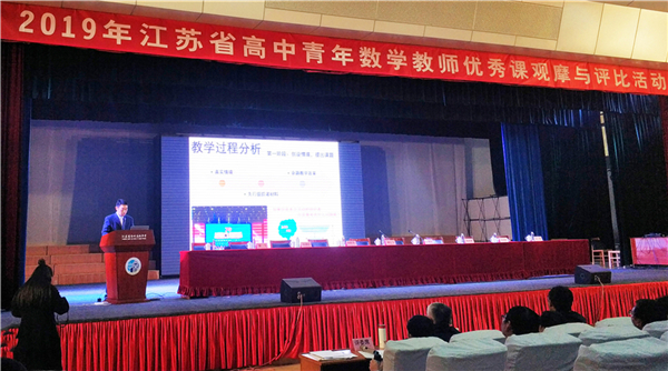 10月24日,2019年江苏省高中青年数学教师优秀课观摩与评比活动在江苏省常州高级中学举行。我校青年教师高劲松以无锡大市第一名的优异成绩,代表无锡市参加决赛,与来自省内13个地市的共27名选手同台角逐,最终以小组第一名的优异成绩获得江苏省青年数学教师优秀课观摩与评比一等奖。