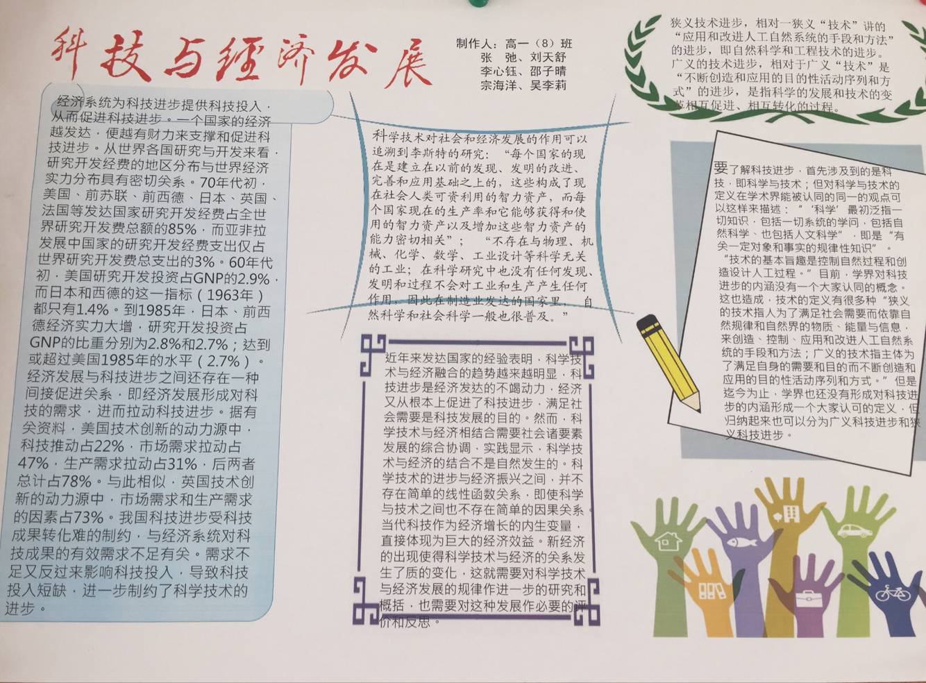 在主题的确定上,高一年级以“科技与经济发展、生活改善、政治进步”为主,高二政治选修班以“科技与文化繁荣、哲学社会科学发展”为主。学生们积极参与,最后制作出小报一百二十份,经过认真筛选、评比,共评出:一、五个班级获“团体优胜奖”;二、二十六个小组获得“个人优胜奖”,其中一等奖五名、二等奖八名、三等奖十三名。