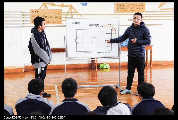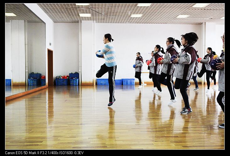 在本次活动中,体育教研组原定5个选项教学班将分别进行展示,无奈天公不作美,当日空气质量指数爆表200以上已达严重污染级别,体育课被迫转移至体育馆进行。几位教师经过短暂的商讨决定以王书文老师的《室内球操》代表展示,张榕佳老师和蒋春潮老师的男女足球选项班进行理论教学。