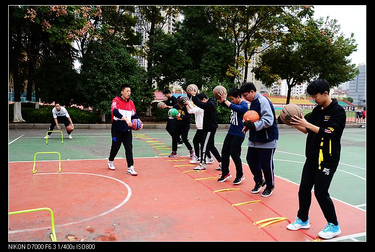在篮球场上宋玮老师开设的一节《专项体能—绳梯练习》的篮球课也让人眼前一亮,四个小组、四块场地、四个绳梯,在激情四射的音乐声中学生们有条不紊的在教师带领下进行绳梯练习。时而交叉上步,时而左右摇摆、时而里外开合,晶莹的汗珠和快乐的笑容挂在了每一个学生的脸上。当结合运球在绳梯上进行练习时,难度的提升使气氛到达高潮,同学们努力的在保持良好运球节奏的同时在绳梯上坐着各种动作,女生也不甘示弱,在最后的展示环节,一位女生的练习也赢得了全场掌声。课后评课专家黄德刚老师提出了宝贵建议他说道:“这是一节成功的课,是一节好课,教师的素养、课的组织、课的目标完成、课的练习密度、练习效果都非常让人满意,如果再与篮球运动的投篮得分结合效果是否会更佳”。