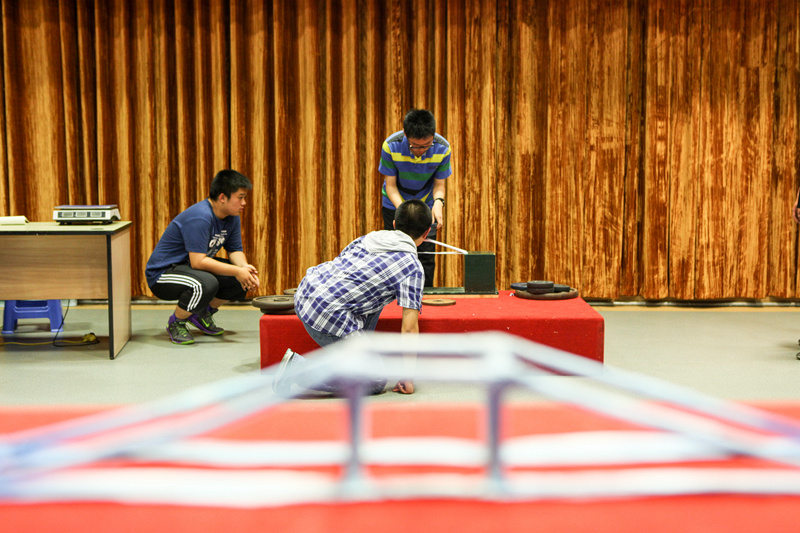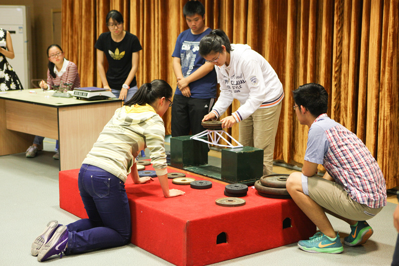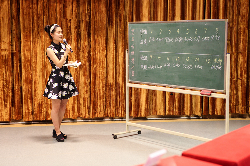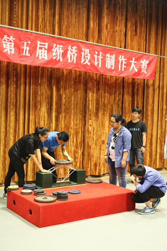 “承重桥”比赛较往年要求更为严格,难度上升:桥的跨度变成50cm,高度不超过12cm,宽度不限,纸桥重量仍为60g。在这样的条件下,同学们依然取得很好的成绩,承重超过10kg的桥比比皆是,冠军桥——13班的纸桥承重达到了32.615kg,第二名5班承重32.165kg,相差仅0.45kg,赛况非常激烈。比赛时,主持人还介绍了其制作的原理、创新与艰辛的过程,让更多的学生了解他们的设计思想。