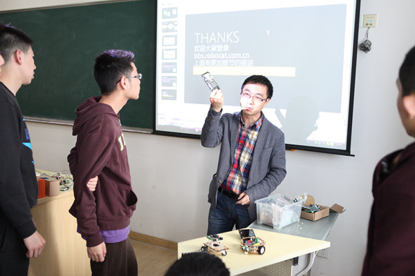 接着,热心创客孟峰将他多年从事机器人小车设计及制作的经验进行分享,并推荐了一些即稳定又经济的机器人控制板和适用于高中生的软件及机器人学习网站。目前,机器人市场中的软硬件产品五花八门,一款易上手并且用户体验良好的软件、一块性能稳定扩展性强且经济的控制板和一个学习与交流的网络平台无疑对机器人学习者们有着很大的帮助。