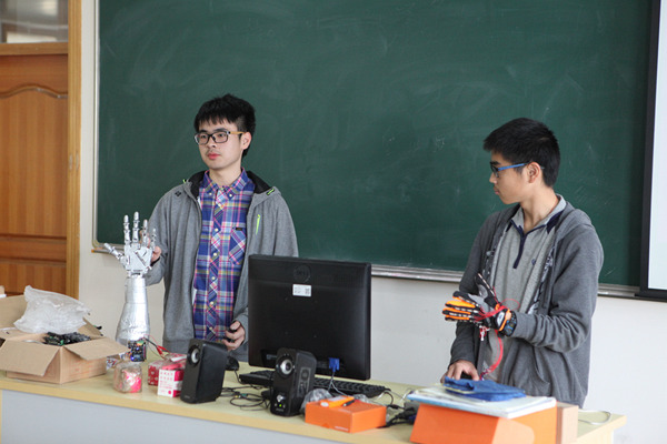 最后,市一中高一科技班学生、imakeit机器人社团的陈坤杰展示了他们完成的作品“基于Arduino的同步机械手”,这款机械手的神奇之处在于它能感知控制者手的动作并同步进行相应的动作。那么这是如何实现的呢?陈坤杰同学帮我们解答了这一困惑。控制者戴着的手套的手指上都安装了一个弯度传感器,该传感器传入的数值会随其弯曲程度的改变而改变。连接手套的控制板会获取弯度传感器传入的数值,机械手上也连接了一块控制板,两块控制板通过蓝牙进行通信,连接机械手的控制板便能控制舵机转动从而使机械手执行相应的动作了。