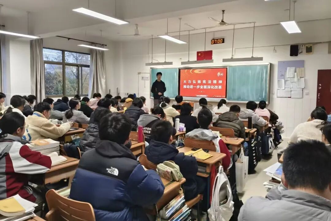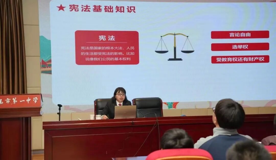 每年举办“宪法宣传周”活动。开展国旗下演讲、系列专题讲座,以案释法,通过解读生动鲜活的案例,深入浅出地引导学生运用法律武器保护自己。各班还组织主题班会课,结合文字、图片和视频等丰富素材让每一位同学深入理解宪法。