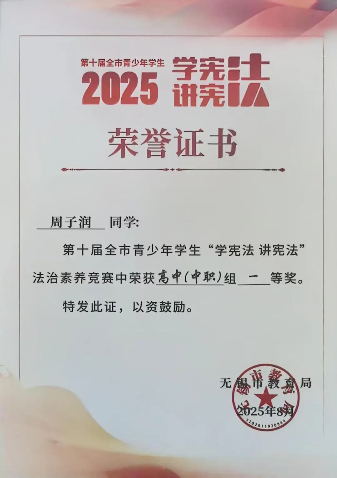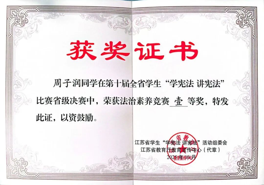 周子润同学斩获法治素养竞赛