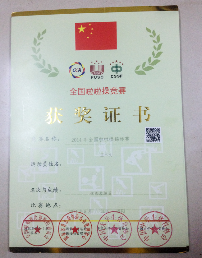 5月24日,我校健美操队在王书文、张榕佳老师的带领下,取得了在溧阳市天目湖城市广场体育馆举办的"2014年全国啦啦操锦标赛"中学乙组爵士课间啦啦操示范动作第一名的骄人成绩,王书文老师获优秀教练员称号。