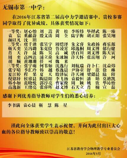 在2016年江苏省第二届高中力学邀请赛中,我校参赛同学取得了优异成绩,屠心怡等15位同学获得一等奖,虞千迪等31位同学获得二等奖,张宇萌等41位同学获得三等奖,在此向获奖同学和指导教师表示祝贺!