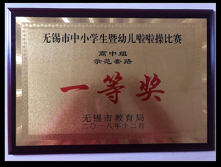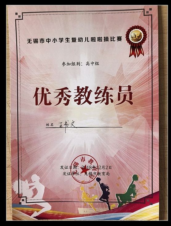 2018年12月2日的无锡市四星级高中啦啦操比赛在无锡市第三高级中学隆重举行,经过激烈角逐我校啦啦操队最终取得了高中组街舞示范套路一等奖,同时,王书文老师获最佳教练员称号。