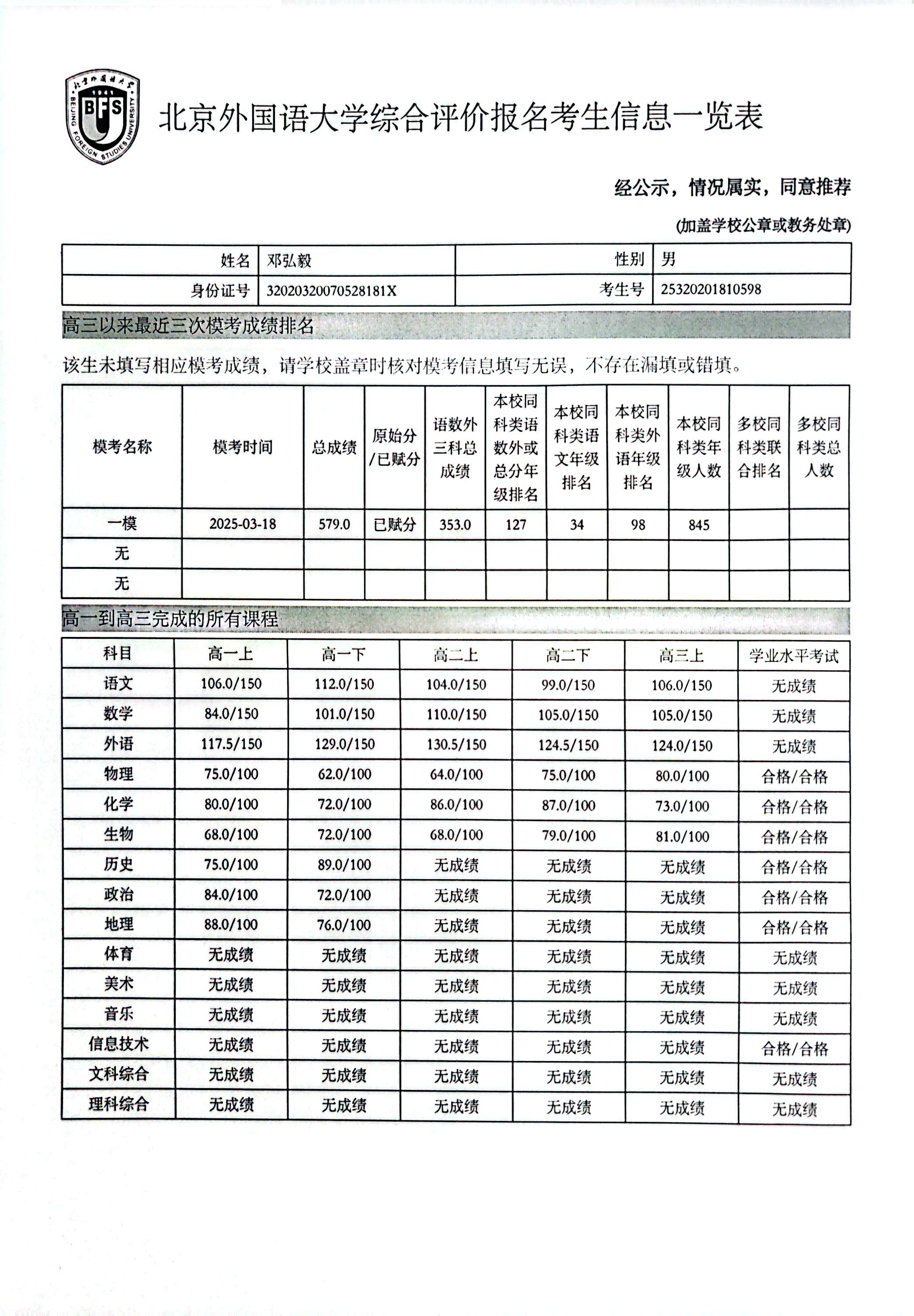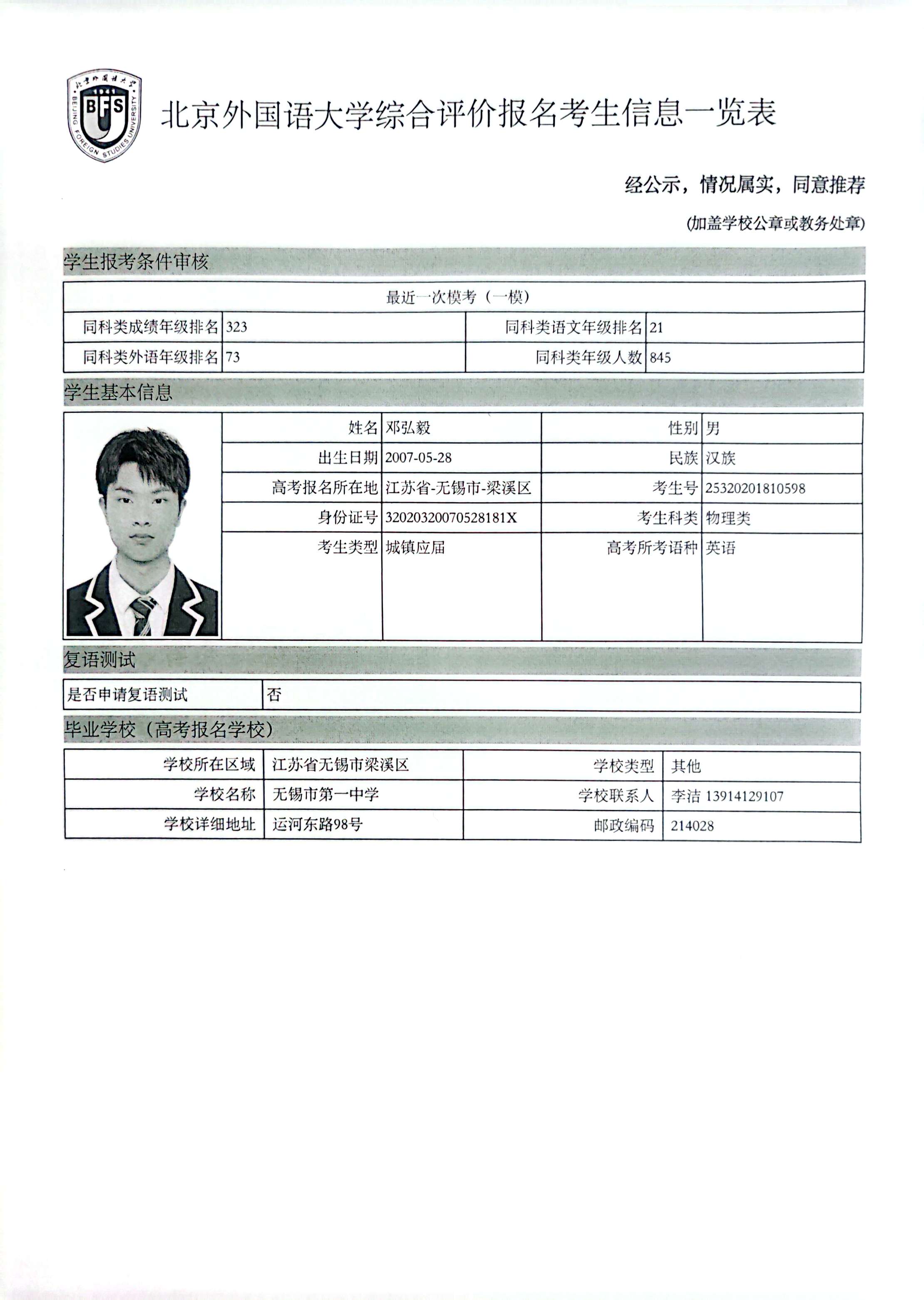 高三10班邓弘毅北京外国语大学综评材料公示